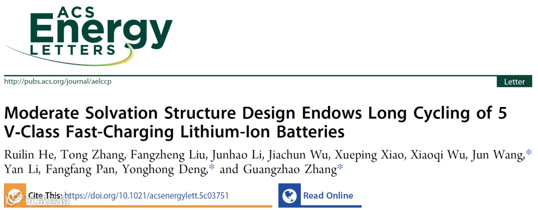 近日,来自南方科技大学大学的张光照、邓永红教授团队在国际知名期刊ACS Energy Letters 上发表题为“Moderate Solvation Structure Design Endows Long Cycling of 5 V‑Class Fast-Charging Lithium-Ion Batteries”的观点文章。该观点文章聚焦中等溶剂化结构设计在高电压电池中的应用,分析对比了常见的碳酸酯类电解液与氟代羧酸酯类电解液的各项差异,指出了氟代羧酸酯在应用于5V级锂离子电池体系中时具有显著的动力学性能及界面稳定性优势。
