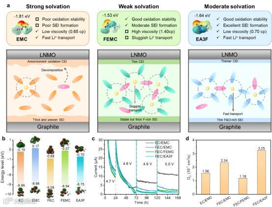 中等溶剂化结构设计实现电解液耐高压性能提升常规的碳酸酯类电解液如碳酸乙烯酯(EC)/碳酸甲乙酯(EMC)在大于4.4 V的电压下开始发生显著的氧化分解,使其难以满足镍锰酸锂电池的工作条件需求,对碳酸酯电解液进行充分氟代后得到的氟代碳酸乙烯酯(FEC)/甲基-2,2,2-三氟乙基碳酸酯(FEMC)电解液尽管可以满足稳定性要求,但高粘度牺牲了电池的能量密度和倍率优势。羧酸酯类溶剂具有优于碳酸酯类溶剂的动力学特性,使其在进行氟取代设计后仍具有较低的粘度,同时也表现出界面稳定性。乙酸-2,2,2-三氟乙酯(EA3F)溶剂促进形成的中等溶剂化结构使其能够耐受5V的截止电压,同时具备高的锂扩散系数。