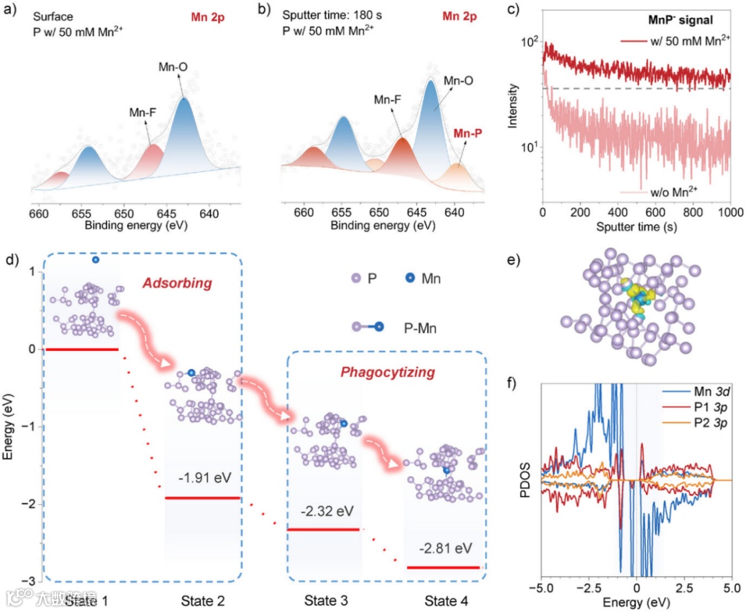 图4:a) 在含 50 mM Mn2+电解液中循环 10 次后,P 电极表面 Mn 2p 能级的 XPS 谱图。b) 在含 50 mM Mn2+电解液中循环 10 次后,P 电极溅射 180 秒后 Mn 2p 能级的 XPS 谱图。c) 在含 50 mM Mn2+电解液中循环 10 次后,P 电极上选定碎片(包括 MnP-)的 ToF-SIMS 深度剖面。d) 计算得到的 Mn 与红磷体相相对位置的能量变化,分为四个不同状态:状态 1、状态 2、状态 3、状态 4。e) 状态 4 下红磷体相在吞噬 Mn 离子过程中的电荷密度分布。f) 状态 4 对应的 PDOS 计算。