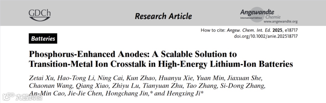 近日,来自中国科学技术大学的季恒星教授团队,在国际知名期刊Angewandte Chemie International Edition上发表题为“Phosphorus-Enhanced Anodes: A Scalable Solution to Transition-Metal Ion Crosstalk in High-Energy Lithium-Ion Batteries”的文章。该文章研究针对高能量锂离子电池中“过渡金属离子串扰”这一关键失效问题,提出了一种创新性的解决方案。研究发现,磷(P)材料对从正极溶解并迁移至负极的过渡金属离子(如Mn²⁺、Ni²⁺、Co²⁺)具有独特的“吞噬效应”,能将其吸收至体相内部,而非任由其沉积在负极表面催化电解液分解和破坏固态电解质界面膜(SEI)。基于此,研究者设计了一种简单的磷增强复合负极,仅需在传统石墨或硅负极中掺入少量磷(最低2 wt.%),即可显著提升电池对过渡金属离子的耐受性。该策略在不改变现有电池制造工艺的前提下,大幅延长了电池循环寿命,为开发下一代高能量密度、长寿命锂离子电池提供了一条具有产业化前景的新路径。