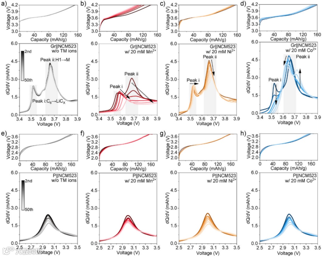 图2:每个子图上方为充电曲线,下方为对应的dQ/dV微分容量曲线:Gr||NCM523电池:a) 不含过渡金属离子,b) 含20 mM Mn2+,c) 含20 mM Ni2+,d) 含20 mM Co2+。同时展示P||NCM523电池的dQ/dV曲线:e) 无过渡金属离子,f) 含20 mM Mn2+,g) 含20 mM Ni2+,h) 含20 mM Co2+。