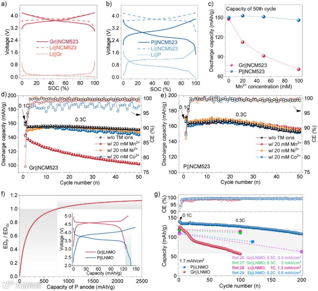 图1:a) Gr 阳极与 NCM523 阴极在半电池中的恒电流充放电曲线,以及对应的 Gr||NCM523 全电池的恒电流充放电曲线。b) P 阳极与 NCM523 阴极在半电池中的恒电流充放电曲线,以及对应的 P||NCM523 全电池的恒电流充放电曲线。c) Gr||NCM523 和 P||NCM523 电池在不同 Mn2+浓度电解液中循环后的容量保持率。d) Gr||NCM523 电池在无 TM 离子和含 20 mM TM 离子(Mn2+、Ni2+、Co2+)电解液中的库仑效率和循环稳定性。e) P||NCM523 电池在无 TM 离子和含 20 mM TM 离子(Mn2+、Ni2+、Co2+)电解液中的库仑效率和循环稳定性。f) 以 P 阳极和 Gr 阳极分别与 LNMO 阴极配对的全电池能量密度比值,表示为 P 阳极容量的函数。插图显示 Gr||LNMO 和 P||LNMO 电池的充放电曲线。g) Gr||LNMO 和 P||LNMO 电池在 0.3C 倍率下的库仑效率和循环稳定性。