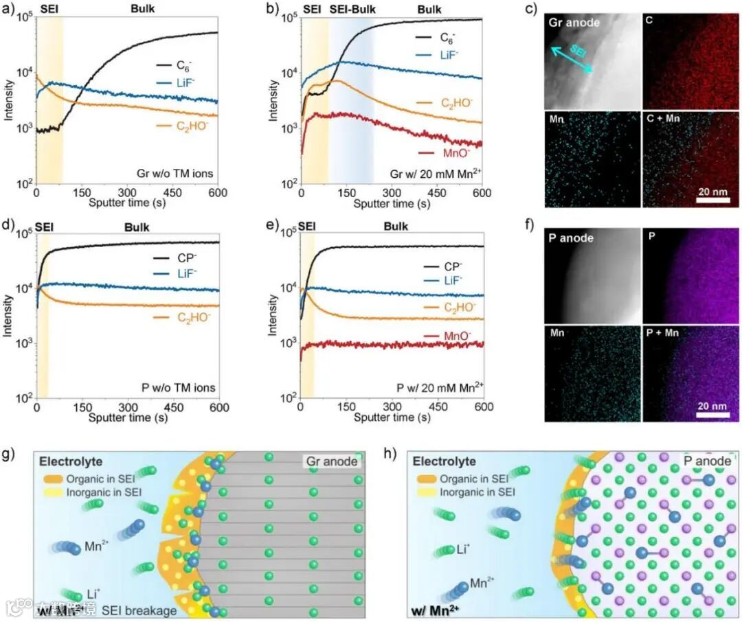 图3:a) 在不含 TM 离子电解液中循环 50 次后,Gr 阳极上选定碎片的 ToF-SIMS 深度剖面。b) 在含 20 mM Mn2+ 电解液中循环 50 次后,Gr 阳极上选定碎片的 ToF-SIMS 深度剖面。c) 循环后 Gr 阳极的 HRTEM 图像及相应的元素分布图。d) 在无 TM 离子电解液中循环 50 次后,P 电极上选定碎片的 ToF-SIMS 深度剖面。e) 在含 20 mM Mn2+电解液中循环 50 次后,P 电极上选定碎片的 ToF-SIMS 深度剖面。f) 循环后 P 阳极的 HRTEM 图像及相应的元素分布图。g) 使用含 20 mM Mn2+电解液的 Gr||NCM523 电池中 Gr 阳极的界面结构示意图。h) 使用含 20 mM Mn2+电解液的 P||NCM523 电池中 P 阳极的界面结构示意图。