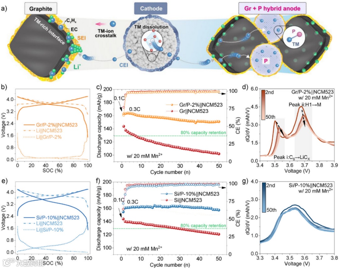 图5:a) 过渡金属离子在Gr和P颗粒间串扰效应的示意图。b) Gr/P-2%复合阳极与NCM523阴极在半电池中的恒电流充放电曲线,以及对应Gr/P-2%||NCM523全电池的恒电流充放电曲线。c) 在含20 mM Mn2+电解液中循环的Gr/P-2%||NCM523电池的库伦效率和循环稳定性。d) Gr/P-2%||NCM523电池在20 mM Mn2+环境下的dQ/dV微分容量曲线。e) Si/P-10%复合阳极与NCM523阴极在半电池中的恒电流充放电曲线,以及对应Si/P-10%||NCM523全电池的恒电流充放电曲线。f) 在含20 mM Mn2+电解液中循环的Si/P-10%||NCM523电池的库伦效率和循环稳定性。g) Si/P-10%||NCM523电池在20 mM Mn2+环境下的dQ/dV微分容量曲线。