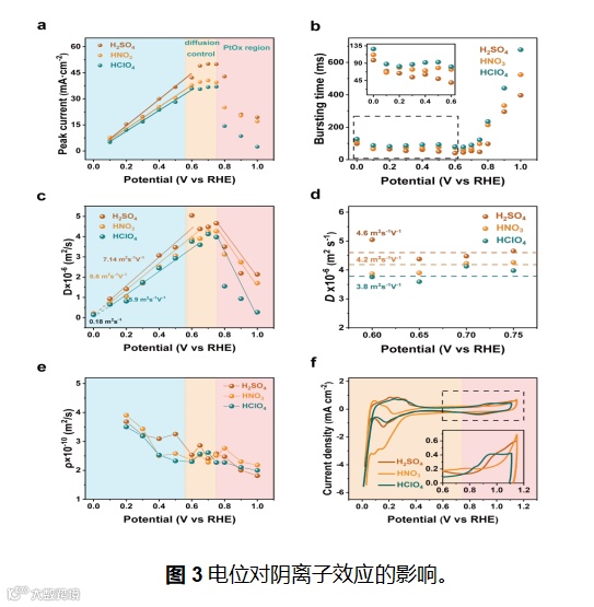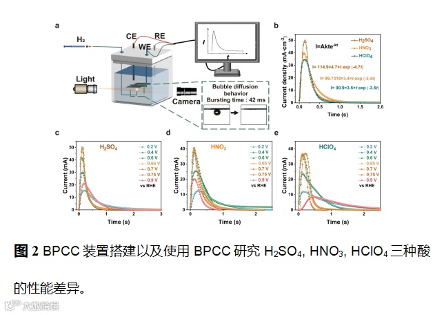 图2展示了所搭建的BPCC装置和所研究的三种酸的性能差异。主要由气体泵送装置,三电极测试装置,观察装置组成。通过泵送单个反应性的气泡进入电极,观察其气泡破裂行为以及电流相应曲线,拟合计算得到反应气体扩散电极性能的两个参数:气体扩散系数(D)和有效活性位点密度(ρEC),从而评价电极扩散性能的好坏。