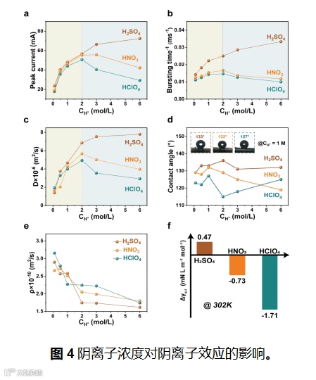 图4进一步考察了阴离子浓度的影响。随着酸浓度提高,硫酸体系中D单调增加,而硝酸与高氯酸体系在2 M时达到峰值后反而下降。这表明在高浓度下,过度亲水的界面导致孔隙被液体占据、气体扩散受阻。ρEC则整体下降,反映阴离子吸附对活性位点的竞争。结合表面张力数据,作者发现三种酸的表现严格遵循Hofmeister序列:SO42- > NO3- > ClO4-,也就是表面张力越高,扩散性能越好。此结果从宏观实验上首次定量证明了阴离子对电极内气体扩散的系统影响。