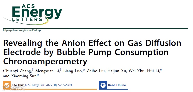 北京化工大学孙晓明教授、罗亮副教授、李晖教授团队在《ACS Energy Letters》期刊上发表题为“Revealing the Anion Effect on Gas Diffusion Electrode by Bubble Pump Consumption Chronoamperometry”的文章。该工作采用气泡泵消耗计时安培法(BPCC),系统考察了在三种典型酸(H₂SO₄、HNO₃ 和 HClO₄)中,不同浓度与外加电位下 GDE 的氢氧化性能。结果表明,阴离子在催化剂表面的吸附会导致有效催化位点减少,并引起表面张力随阴离子浓度与施加电位的变化而改变。结合分子动力学模拟发现,GDE 内的气体扩散能力依次为 SO₄²⁻ > NO₃⁻ > ClO₄⁻,与 Hofmeister 阴离子序列一致。通过 BPCC 方法,本研究不仅从气体扩散的角度揭示了酸性条件下氢氧化动力学的本质机制,还为理解实际能量转换体系中由电浸润效应引起的润湿性变化提供了新的见解。