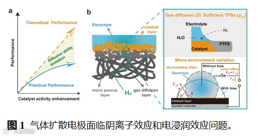 在燃料电池与电催化反应研究中,气体扩散电极(GDE) 是实现高效反应的关键结构。它通过在固体催化剂、液体电解质与气体反应物之间构建三相界面(TPB),实现了高通量的气体传质与电子转移。然而,即使在催化剂活性不断提升的今天,GDE 的性能依然常常被“气体扩散”这一隐性瓶颈所限制。更复杂的是,电解液阴离子的类型与浓度也在默默影响这一过程,在原位反应时的电浸润问题更加重了这一问题(图1)。而目前行业对GDE中受电解质效应影响的扩散问题认识不足,同时缺乏很好的手段观察表征。
