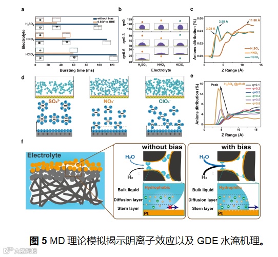 图5使用MD模拟揭示了阴离子效应并给出了GDE水淹机理:在多孔电极内部,电位与电解质成分共同决定了气体扩散通道的开放与闭合。H2SO4体系中较强的表面张力维持了良好的通气性,而HNO3和HClO4体系的高亲水性则易导致电极“水淹”。BPCC方法不仅能够实时捕捉这一过程,更能用量化参数反映气体扩散与催化活性之间的耦合关系。
