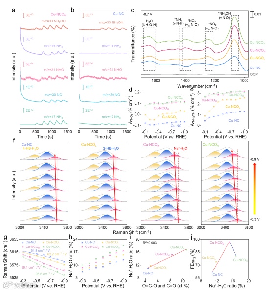 图4. (a-b)Cu-NCOM和 Cu-NC上NO3RR的原位DEMS 检测图;(c)Cu-NC、Cu-NCOL、Cu-NCOM和Cu-NCOH在−0.7 V下的电化学原位FTIR光谱;(d)不同电位下*NO3的积分峰面积;(e)不同电位下 *NH2OH 的积分峰面积(正值表示消耗;负值表示积累);(f)原位拉曼光谱高斯拟合得到的界面水三种O-H 伸缩振动模式;(g)原位拉曼光谱中 Na+-H2O随电位变化的频率图;(h)不同电位下所有样品的Na+-H2O比值;(i)−0.7 V 下Na+-H2O比值与对应Cu-NCOx中 O=C-O 与 C=O 总含量的线性关系;(j)−0.7 V 下四种样品的 FENH3与 Na+-H2O比值的火山型关系。