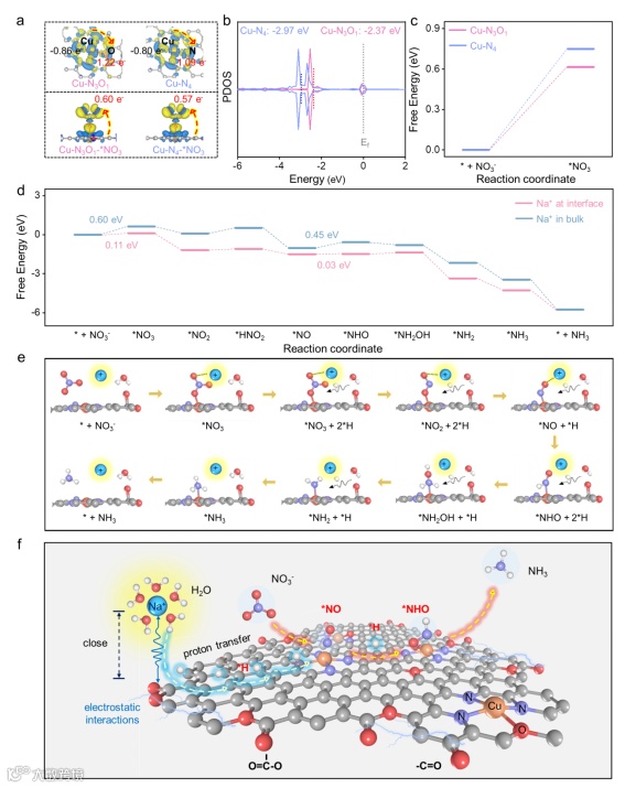 图6. (a)Cu-N3O1、Cu-N4、Cu-N3O1-*NO3和 Cu-N4-*NO3模型的差分电荷密度(EDD);(b)Cu-N3O1与Cu-N4模型的投影态密度(PDOS);(c)Cu-N3O1与Cu-N4模型上 * + NO3- → *NO3的吉布斯自由能;(d)在“Na+ at interface”与“Na+ in bulk”两种模型下 NO3RR 的吉布斯自由能图;(e)NO3RR 在 Cu-NCOx模型上的反应机理;(f)水合 Na+提升Cu-NCOx表面NO3RR 的示意图。