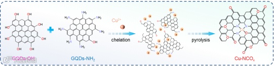 首先采用改进的分子融合法,在温和水热条件下合成了水溶性胺基功能化石墨烯量子点(GQDs-NH₂)与羟基功能化石墨烯量子点(GQDs-OH)。随后,Cu阳离子通过与胺基之间的强螯合作用被限制在石墨烯量子点表面。接着在富氨气氛下进行热解处理。通过在第一步向胺基功能化石墨烯量子点溶液中添加不同量的羟基功能化石墨烯量子点,最终得到一系列氧含量各异的Cu-NCOₓ催化剂。