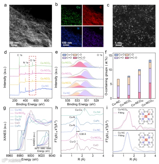 图2. (a-b)Cu–NCOM 的 EDS 元素分布图;(c)Cu–NCOM 的 AC HAADF-STEM 图像;(d)所有样品的 XPS 全谱;(e)O 1s 的高分辨 XPS 光谱;(f)根据 O 1s XPS 光谱得到的不同含氧官能团含量;(g)Cu-NCOM、Cu-NC、Cu foil、Cu2O、CuO 和 CuPc 的 Cu K 边 XANES 光谱;(h)Cu-NCOM、Cu-NC、Cu foil、Cu2O、CuO 和 CuPc的 k3 加权 Cu K 边 EXAFS(FT)光谱;(i)Cu-NCOM 与 Cu-NC 在 Cu K 边的 R 空间 EXAFS 拟合结果。插图为 Cu-N3O1和 Cu-N4位点的结构模型(Cu:橙;N:紫;O:红;C:灰)。