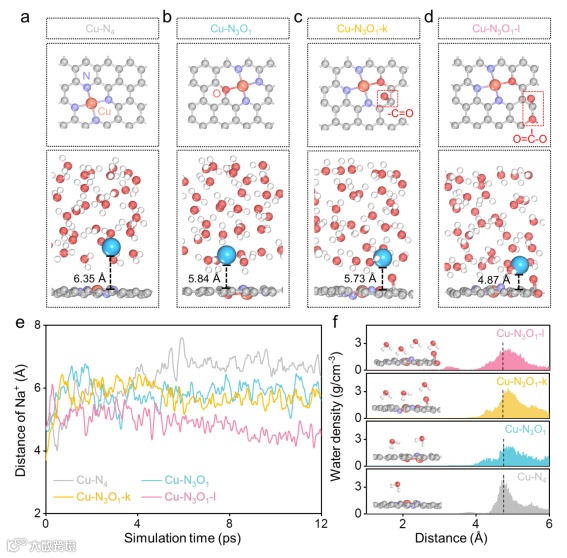 图5. 采用 AIMD 方法在 12 ps 时刻得到的各类离子吸附于以下模型表面的快照:(a)Cu-N4;(b)Cu-N3O1;(c)Cu-N3O1-k;(d)Cu-N3O1-l(Cu:橙;N:紫;O:红;H:白;C:灰;Na:蓝)。(e)吸附 Na⁺ 与表面的距离;(f)Cu 单原子催化剂模型在 1-6 Å 范围内的模拟界面水密度分布。