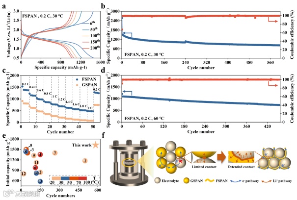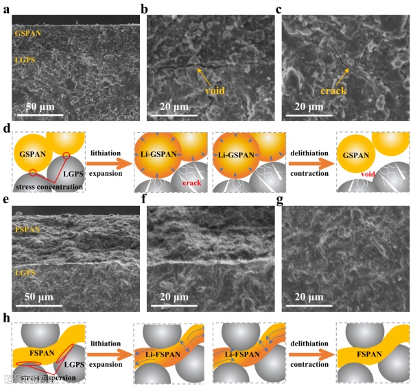 如图5所示,通过对循环100次后的全固态SPAN电池进行拆解分析,发现传统GSPAN电极因活性物质在充放电过程中发生各向同性体积变化,导致与刚性电解质颗粒间产生显著界面空隙及电解质裂纹扩展。这种体积波动使界面接触点产生应力集中,循环过程中刚性电解质无法有效协调体积变化,致使界面空隙持续恶化。相比之下,FSPAN纳米纤维凭借其纤维结构优势,可有效适应充放电过程中的体积波动,从而显著抑制电极膨胀。该特性有效维持了稳定的界面接触,降低界面阻抗,从而为实现高性能全固态锂硫电池提供了关键解决方案。