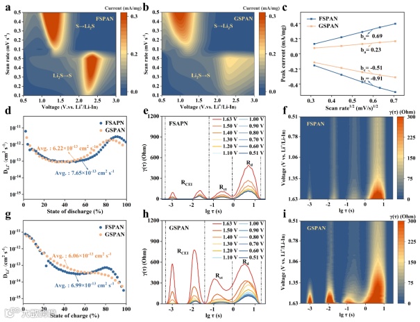 通过电化学动力学的一系列测试进一步探究了FSPAN正极的优秀电荷传输特性。如图4所示,循环伏安测试显示FSPAN复合正极具有更高的峰值电流,表明其氧化还原反应更剧烈。塔菲尔斜率分析证实FSPAN具有更优越的氧化还原动力学。且FSPAN正极在充放电过程中的平均锂离子扩散系数分别为7.65×10-13 cm2/s和6.99×10-13 cm2/s,均优于GSPAN正极。DRT测试说明FSPAN正极在整个放电过程中始终保持更低且更稳定的电极-电解质界面阻抗和电荷转移阻抗,而GSPAN则在初始放电阶段表现出较高的界面阻抗。这些结果明确证实,FSPAN的柔性纳米纤维结构通过构建稳定的离子/电子传输通道,显著提升了全固态锂硫电池的反应动力学性能和电化学稳定性。