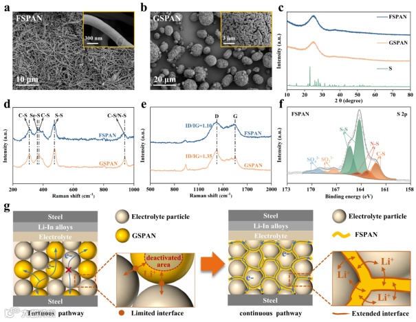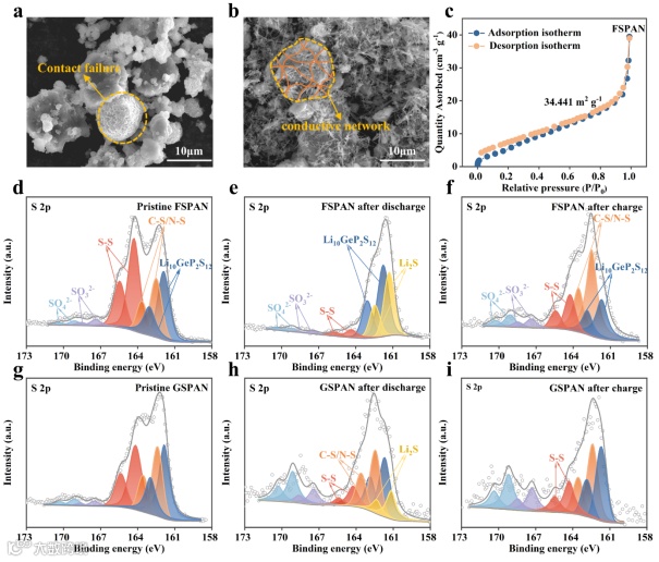 图2中SEM显示出微米级尺寸的GSPAN微粒与电解质颗粒接触不充分,导致循环过程中颗粒表面暴露。对比之下,三维互联的FSPAN纳米纤维则被电解质颗粒完全围绕包覆,由此构建出连续均匀的导电网络,同时有效缩短了载流子传输路径。BET曲线也证实FSPAN纳米纤维具有更高的比表面积,与电解质颗粒的接触面积更加充分。通过XPS对锂化/脱锂后的复合正极成分进行表征,证明FSPAN正极中的硫物种(S-S/C-S/N-S)在锂化过程中几乎全部转化为Li₂S,而GSPAN正极中则残留大量未锂化的硫物种。这种差异证明FSPAN纳米纤维形成的连续导电网络及丰富的离子/电子传输界面,有效促进了载流子的快速传输与活性物质的充分利用。