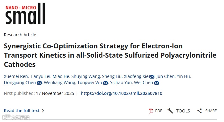 近日,电子科技大学陈伟副教授在期刊《Small》上发表了最新研究成果“全固态硫化聚丙烯腈正极电子-离子输运动力学的协同优化策略”(Synergistic Co-optimization Strategy for Electron-Ion Transport Kinetics in All-Solid-State Sulfurized Polyacrylonitrile Cathodes)。研究者结合静电纺丝与高温热解方法制备了纳米纤维状硫化聚丙烯腈正极(FSPAN正极),利用其三维互联纳米纤维结构构建了连续的导电网络,从而为有效的电荷载流子迁移提供了畅通的传输途径。这种结构设计显著降低了界面阻抗,从而通过优化离子/电子传输动力学增强了电极的氧化还原动力学。该研究强调了活性材料形态在全固态SPAN正极内构建高效电荷载流子传输网络中的重要性,并提出了一种微结构设计范式,以克服传统SPAN电极的瓶颈,为下一代全固态电池系统的发展提供了重要的见解。