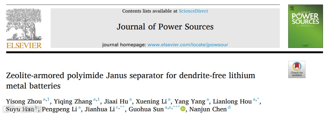 近日,河北科技大学的孙国华教授等在国际知名期刊Journal of Power Sources上发表题为“Zeolite-armored polyimide Janus separator for dendrite-free lithium metal batteries”的研究论文。文章中通过简易的真空抽滤法将USY型沸石沉积在聚酰亚胺纳米纤维膜表面,开发出一种功能化PI/USY隔膜,该设计能有效抑制纳米纤维间的滑移以提升力学强度,通过其复合隔膜的微孔结构调控锂离子传输,同时USY层可作为刚性屏障阻止锂枝晶穿透,本研究为功能型隔膜在抑制锂枝晶方面的应用提供了重要的理论和实验依据。