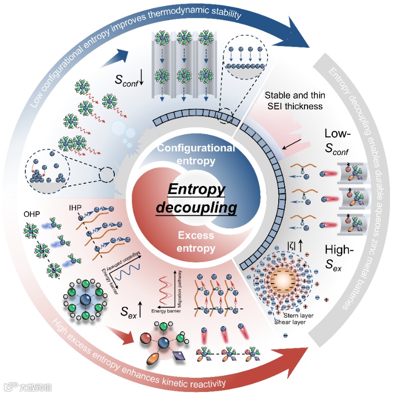 水系锌金属电池(AZMBs)因其电解质固有的安全性,以及锌金属负极的高理论容量、低氧化还原电位和丰富的地壳储量,在大规模储能应用(如电网调峰)中展现出巨大潜力。然而,电化学体系会自发发生熵增,高活性的水系环境容易引发非预期的行为。通常,锌离子在界面非均匀电场作用下易迁移聚集形成枝晶,而电极晶格内电荷分布不均则会诱发分解副反应等。这导致锌负极枝晶生长、正极活性物质溶解以及迟缓的Zn2+扩散动力学等关键问题。理论上,需要通过有序的离子/电荷传输和反应过程来抑制这些副反应,但这类熵减机制似乎与主流的高熵策略形成悖论关系。因此,从熵的角度调控离子传输与电子相互作用之间的微妙平衡至关重要。