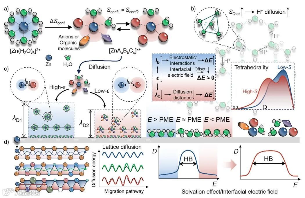 图3. 离子传输过程中的熵效应。a) Zn2+溶剂化结构及重构策略。b) 通过调控H2O分子的四面体熵和氢键网络增强质子传输。c) 由于熵效应的多面性,多个关键参数影响电双层。d) 熵效应对离子晶格扩散影响的示意图。
