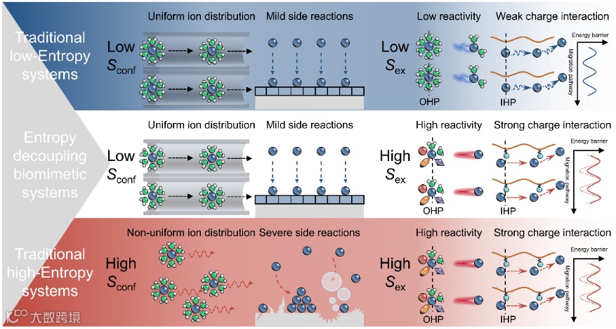 仿生有序性涵盖形貌结构有序性、分子排列有序性和电荷分布有序性三个维度。借助仿生材料这些独特的有序特性,熵工程可显著提升AZMBs中的离子迁移效率。熵解耦仿生系统与传统低熵/高熵系统存在本质差异。熵解耦仿生系统通常通过协同利用一种或多种仿生特性,实现低Sconf与高Sex的协同作用。这种与传统体系中单一熵调控截然不同,成功解决了电池系统高反应活性与弱副反应之间的固有矛盾。