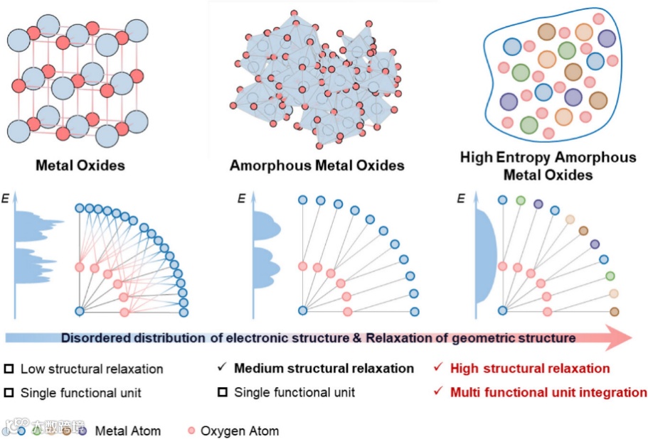 图1. 高熵非晶结构优点示意图。上半部分展示了金属氧化物、无定形金属氧化物和高熵无定形金属氧化的结构示意图,而下半部分则展示了它们相应的电子结构和子图。
