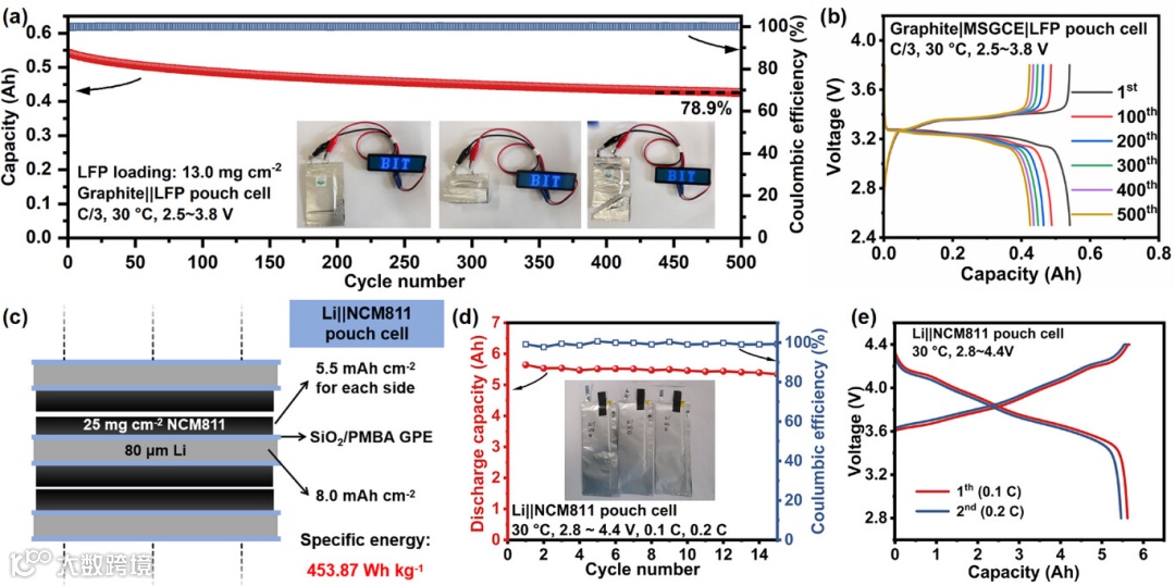 图6. (a) 石墨||磷酸铁锂软包电池在C/3倍率下的循环性能及(b)对应电压曲线。(a)图插图为柔性软包电池在不同机械变形状态下点亮LED灯的照片(测试条件:平整状态、多次弯折状态及切割状态,均处于通电工况)。 (c) 能量密度达453.87 Wh kg-1的~5.6 Ah锂金属||NCM811软包电池层状结构示意图。 (d) 锂金属||NCM811软包电池在4.4V充电截止电压下的循环性能(首圈0.1C充放电活化,后续0.2C循环)。插图为软包电池实物照片。 (e) 首圈(0.1C化成)与第二圈(0.2C循环)对应的电压曲线。