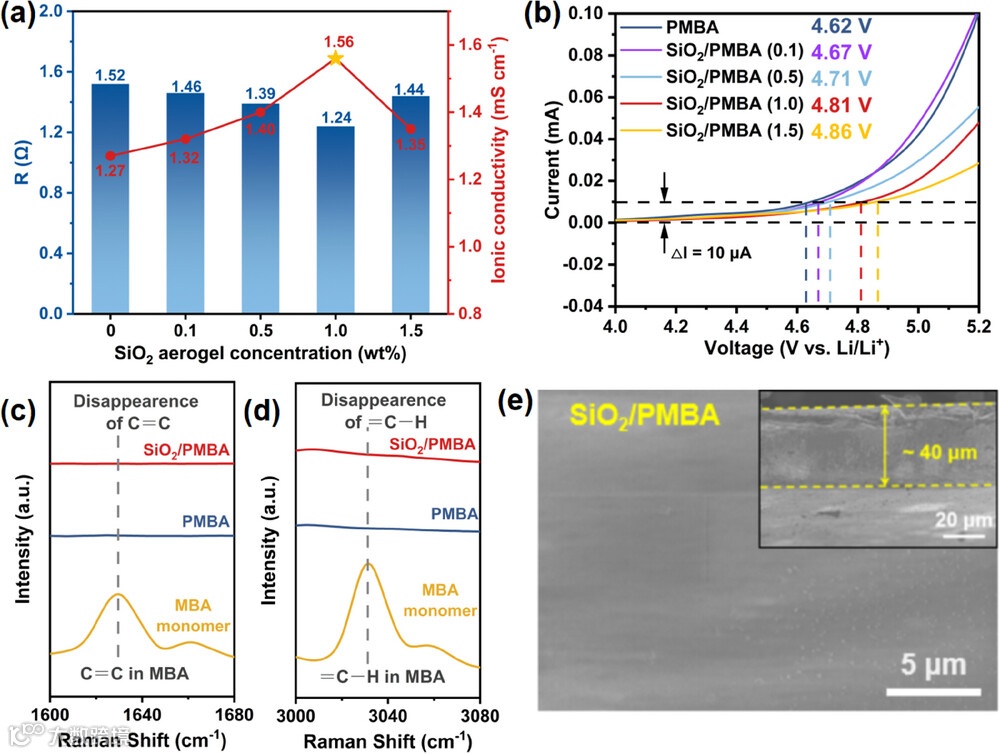 图1. (a) 不同二氧化硅气凝胶填充量的SiO2/PMBA凝胶聚合物电解质在室温下的离子电导率。(b) 不同二氧化硅气凝胶填充量的SiO2/PMBA凝胶聚合物电解质的线性扫描伏安曲线。(c、d)MBA单体、PMBA凝胶聚合物电解质及SiO2/PMBA凝胶聚合物电解质的拉曼光谱。(e) SiO2/PMBA凝胶聚合物电解质的表面SEM形貌图,插图为截面形貌。