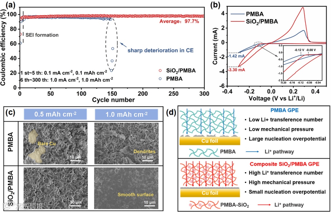 图3. (a) 基于PMBA与SiO2/PMBA凝胶聚合物电解质的Li||Cu电池的锂沉积/剥离库仑效率。 (b) Li||Cu电池的的锂沉积/剥离循环伏安曲线。 (c) Li||Cu电池在0.5与1.0 mAh cm-2容量下的沉积锂形貌。 (d) 基于PMBA与SiO2/PMBA凝胶聚合物电解质的Li||Cu电池中铜箔表面锂成核与生长机理示意图。