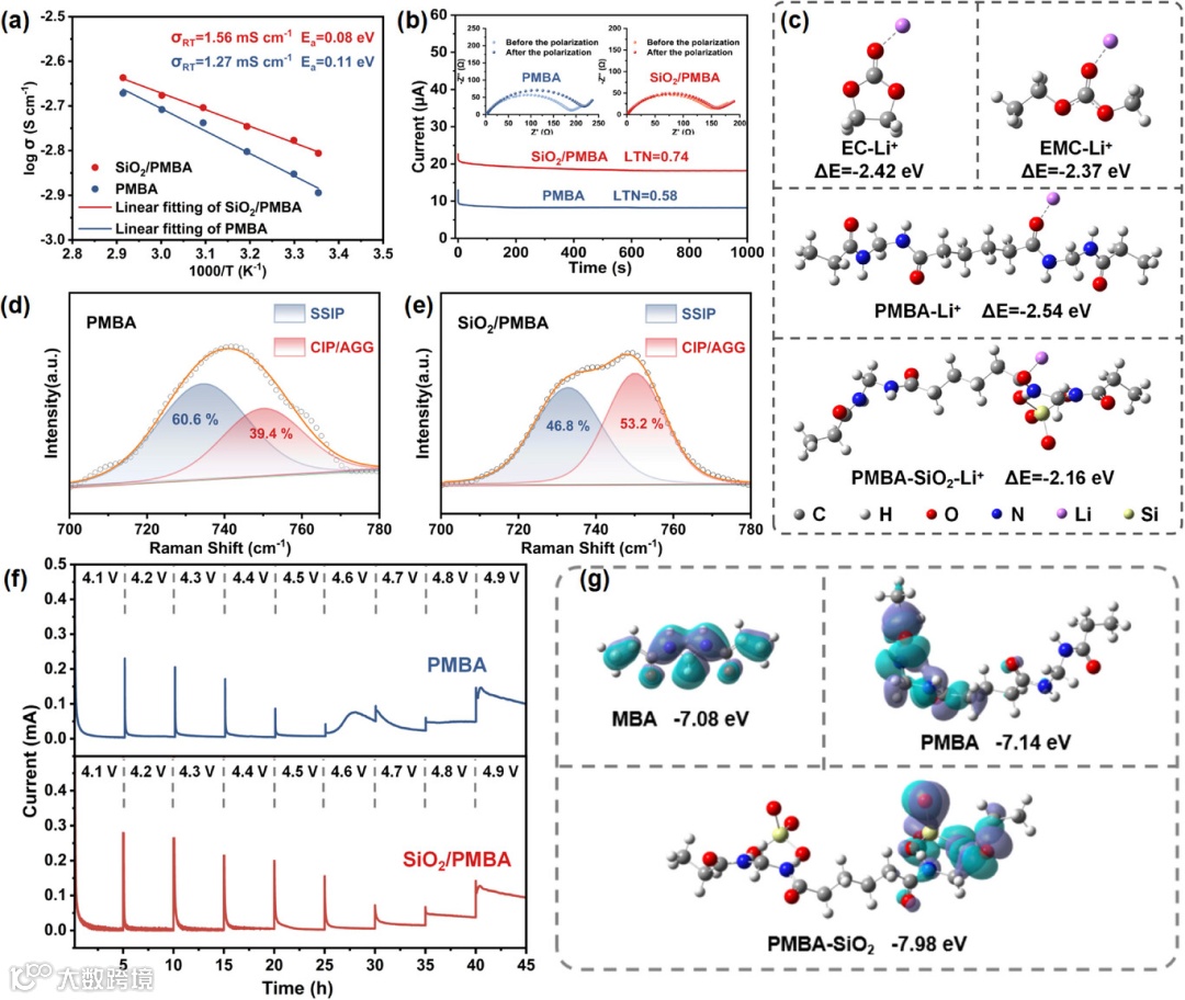 图2. (a) PMBA与SiO2/PMBA凝胶聚合物电解质随温度变化的离子电导率及阿伦尼乌斯拟合曲线。(b) 基于PMBA与SiO2/PMBA凝胶聚合物电解质的Li||Li对称电池在10 mV极化电压下的计时电流曲线,插图为极化前后的对应奈奎斯特图。(c) 三种复合体系的结合能。(d) PMBA凝胶聚合物电解质与(e) SiO2/PMBA凝胶聚合物电解质的溶剂化结构分析。(f) 采用NCM正极的PMBA与SiO2/PMBA凝胶聚合物电解质电化学浮动测试结果。(g) HOMO能级的密度泛函理论计算结果。