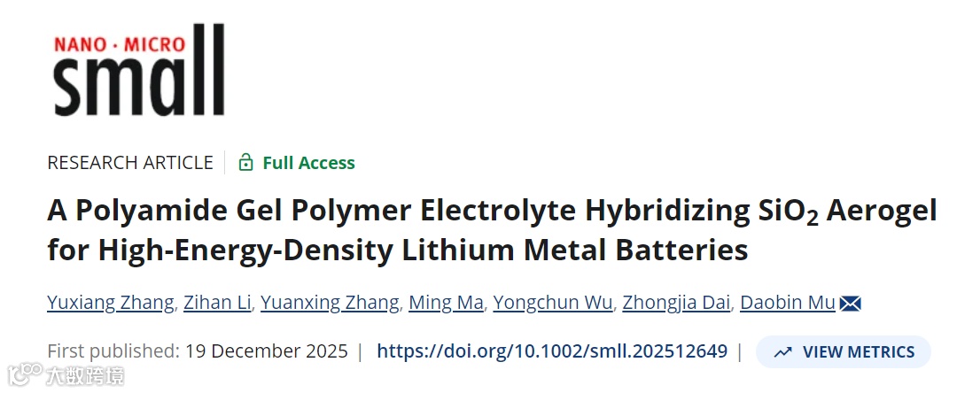 近日,北京理工大学的穆道斌教授团队与中国石油化工股份有限公司石油化工科学研究院戴仲葭合作,在国际知名期刊Small上发表题为“A Polyamide Gel Polymer Electrolyte Hybridizing SiO2 Aerogel for High-Energy-Density Lithium Metal Batteries”的观点文章。该研究论文分析了现在常用的凝胶聚合物电解质在高能量密度锂金属电池中存在的离子导电性不足、固体电解质界面不稳定及锂枝晶生长等关键问题,同时报道了近期通过原位聚合将 SiO2气凝胶与聚(N,N'- 亚甲基双丙烯酰胺)(PMBA)复合构建 SiO2/PMBA 凝胶聚合物电解质,通过调控Li+传输与溶剂化结构、促进富含 Li3N 和 LiF 的稳定界面形成以解决此类问题的研究成果。