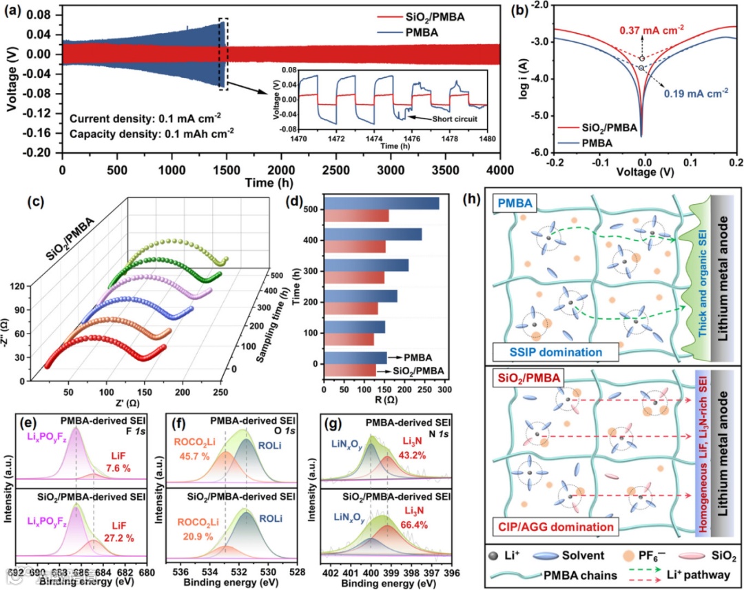 图4. (a) 基于PMBA与SiO2/PMBA凝胶聚合物电解质的Li||Li电池的恒电流循环曲线。 (b) 基于PMBA与SiO2/PMBA凝胶聚合物电解质的Li||Li电池的塔菲尔曲线。 (c) 基于SiO2/PMBA凝胶聚合物电解质的Li||Li电池在不同循环周期下的电化学阻抗谱。 (d) Li||Li对称电池在不同循环周期下的阻抗演变。 (e) 不同电解质中循环后锂负极表面SEI膜的F 1s、(f) O 1s及(g) N 1s XPS能谱。 (h) PMBA与SiO2/PMBA凝胶聚合物电解质中Li+溶剂化鞘层结构示意图及其对锂沉积行为与界面特性的影响机制。