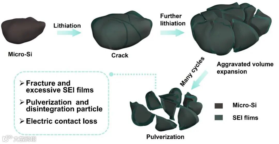 1、严重应力集中:微米硅体积膨胀剧烈、应力集中更严重,导致颗粒破裂与电极粉化。