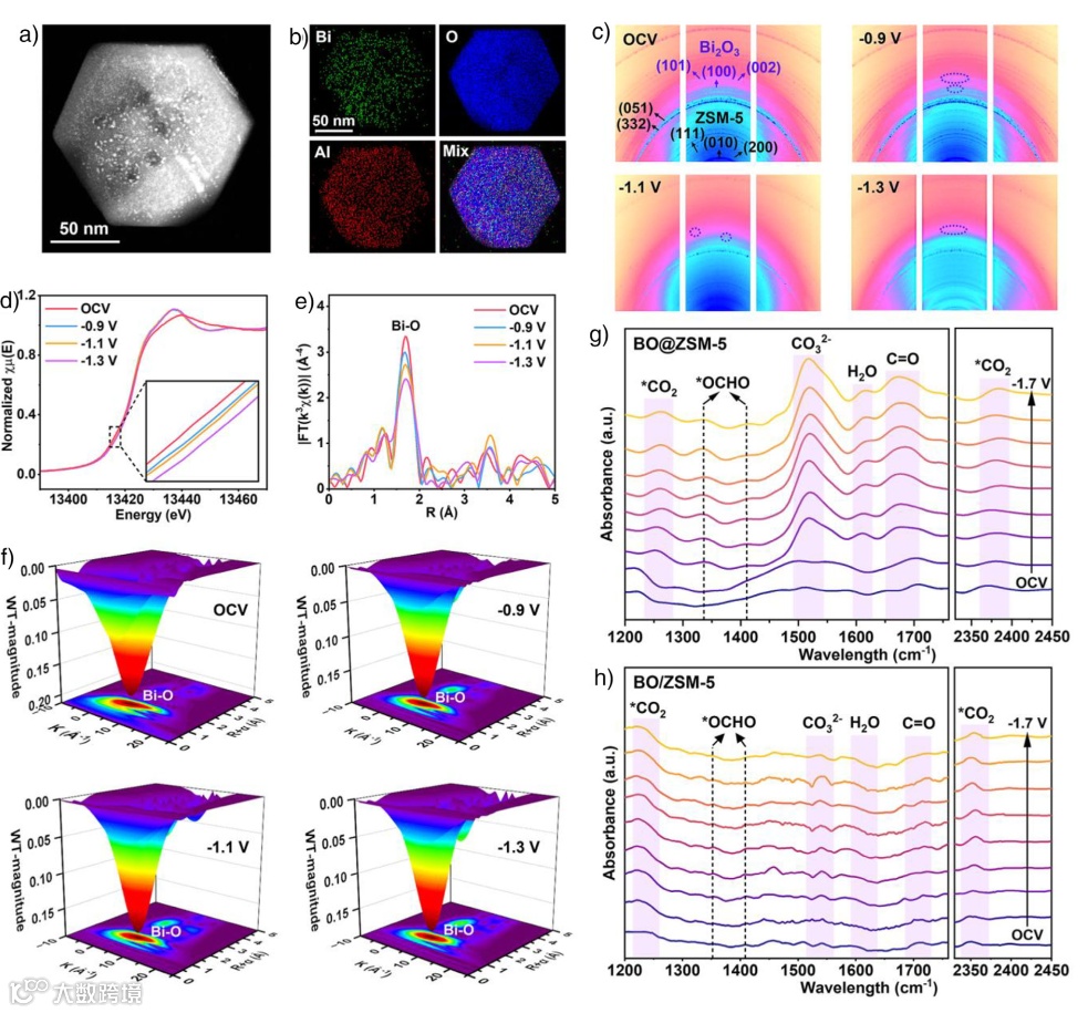 图4. 酸性CO₂RR过程中的结构演变和中间体检测。a) 长期酸性CO₂电解后BO@ZSM-5的HAADF-STEM图像和b) 对应的元素分布图像。c) 酸性CO₂RR过程中,BO@ZSM-5在不同施加电位下的原位同步辐射2D-XRD图谱。酸性CO₂RR过程中,BO@ZSM-5在不同施加电位下的原位Bi L₃-边d) XANES, e) 傅里叶变换EXAFS, f) 小波变换光谱。酸性CO₂RR过程中,记录的g) BO@ZSM-5和h) BO/ZSM-5的原位ATR-SEIRAS光谱。