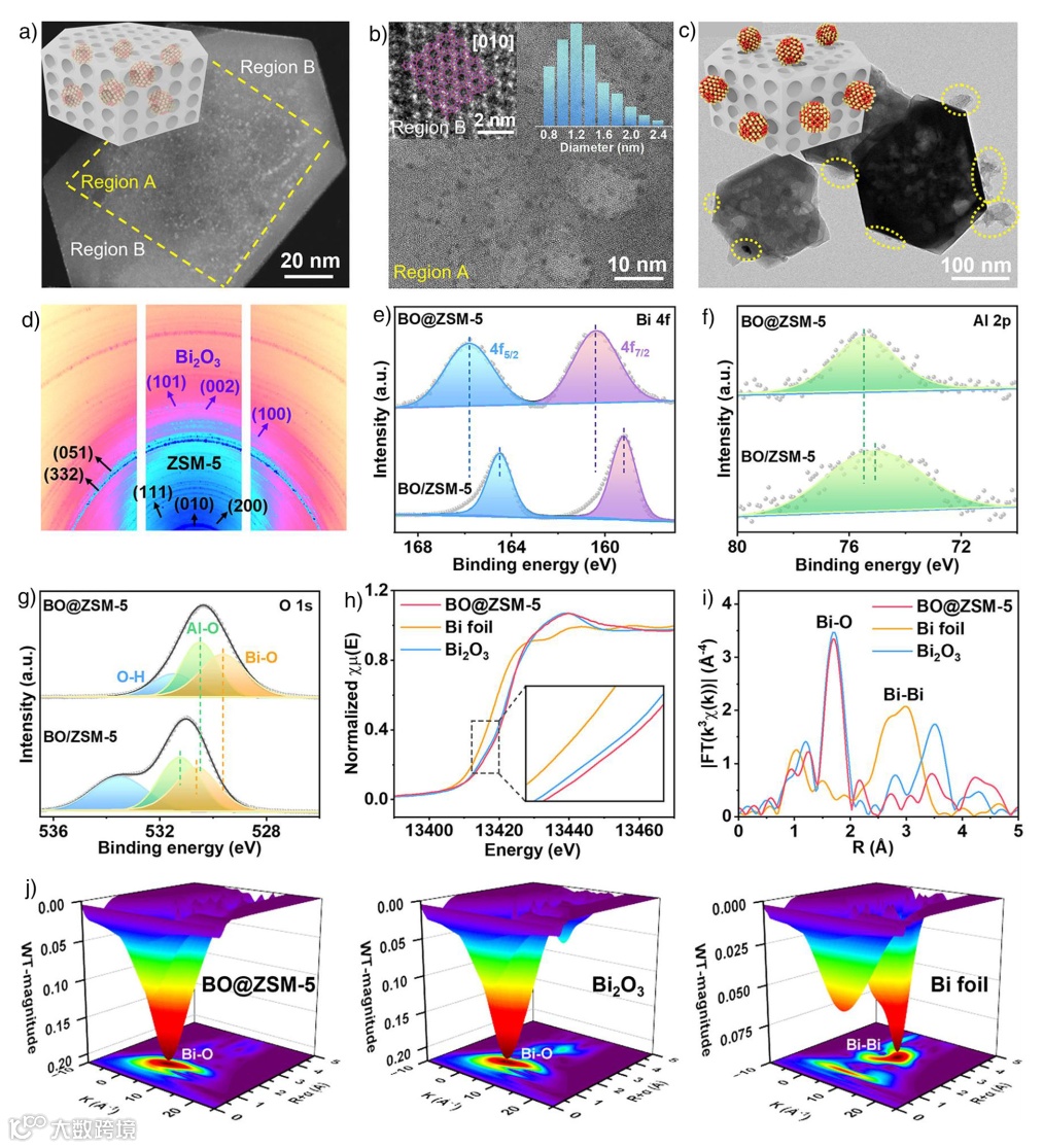 图2. 催化剂结构表征。a) BO@ZSM-5的HAADF-STEM图像,表征Bi₂O₃ NPs分布;区域A富Bi₂O₃ NPs,区域B几乎未观察到;插图示意BO@ZSM-5的结构。b) BO@ZSM-5的层析剖面TEM图像;左上插图示出沸石ZSM-5的微区,覆盖了来自[010]投影的结构模型;右上插图示出Bi₂O₃ NPs尺寸分布。c) BO/ZSM-5的TEM图像;黄色椭圆标出Bi₂O₃颗粒;插图示出BO/ZSM-5的设想结构。d) BO@ZSM-5的同步辐射2D-XRD图谱。e) Bi 4f, f) Al 2p, g) O 1s的XPS光谱。h) Bi L₃-边XANES, i) 傅里叶变换EXAFS, j) 各种样品的小波变换光谱。