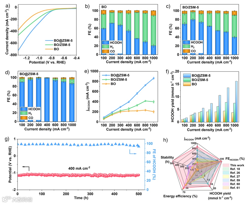 图3. 酸性CO₂RR性能。a) 各种样品的LSV曲线。b) BO, c) BO/ZSM-5, d) BO@ZSM-5的产物分布和法拉第效率。e) 各种催化剂的HCOOH分电流密度和f) HCOOH产率。g) BO@ZSM-5在400 mA cm⁻²电流密度下的稳定性。h) 与最近报道先进的CO₂RR产甲酸/甲酸盐催化剂在HCOOH分电流密度、HCOOH法拉第效率、HCOOH产率、阴极能效和稳定性方面的性能比较。