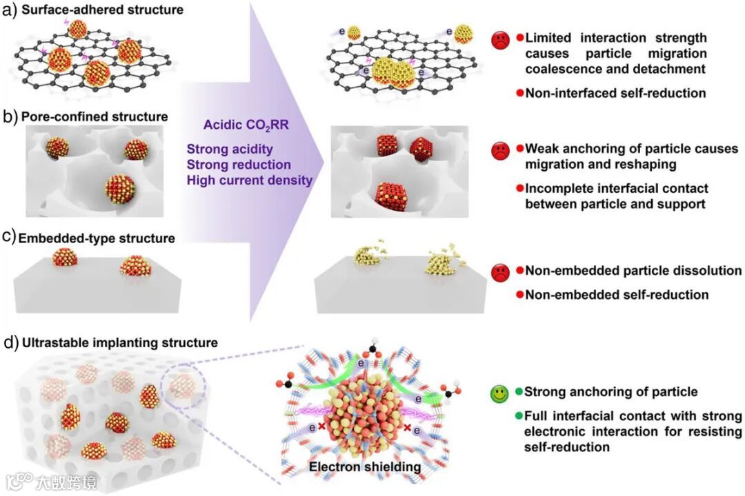 构建金属氧化物-载体相互作用(MOSI)是一种有效的策略。目前,根据金属氧化物与载体的空间分布模式,可分为以下几种类型的MOSI:表面附着结构、孔限域结构和嵌入型结构(图1)。大多数负载型金属氧化物催化剂属于附着型(图1a),因其易于合成且适用性广,但有限的相互作用强度导致催化反应过程中NPs的迁移团聚和脱落;同时,这种有限的界面接触仍然会使大量处于非界面区域的氧化物在CO2RR过程中发生自还原。对于孔限域结构(图1b),尽管在纳米孔中容纳小尺寸NPs(NPs尺寸<孔径)可以调节其表面的电荷分布,但是孔道限域结构通常表现出对NPs的锚定作用较弱,导致NPs在多孔通道中可移动,并在恶劣的反应条件下伴随着不可控的形状改变和重塑,造成稳定性不足;同时,NPs与载体孔壁之间的不完全界面接触导致电子相互作用有限。此外,对于嵌入型结构(图1c),虽然NPs可以被固定,但暴露在载体之外的非嵌入区域仍然面临NPs溶解和一定程度的自还原风险,导致活性位点的损失。因此,设计一种能够在工业电流密度下实现持久和选择性高的酸性CO2电解催化剂仍然是一个巨大挑战。