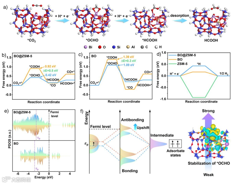 图5. 催化机理的理论计算。a) 在BO@ZSM-5上CO₂RR生成HCOOH的反应路径。b) BO@ZSM-5和c) BO上生成HCOOH和竞争性产物CO的吉布斯自由能图。d) HER的吉布斯自由能图。e) BO@ZSM-5和BO的Bi p-轨道分波态密度。f) 通过改变金属p带中心(εp)增强活性位点-中间体相互作用的示意图。右插图展示带有吸附*OCHO中间体的BO@ZSM-5的差分电荷密度。黄色和青色等值面分别代表电荷积累和损耗。