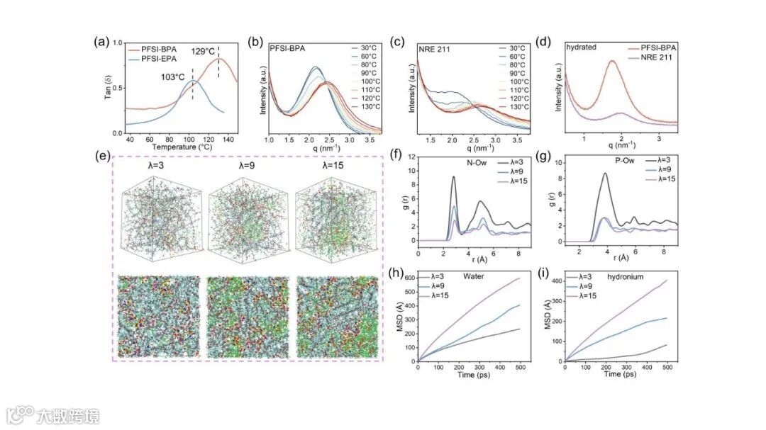 PFSI-BPA展现出显著的超亲水性、吸水性以及加快的水扩散速率。而且,分子动力学(MD)模拟表明,在高湿度环境下,PFSI-BPA 会形成更大的亲水区域,增强了水和水合质子的传输。通过动态蒸汽吸附、水蒸气透过和原位红外测试手段证明了PFS-BPA快速的水分子扩散动力学特征。此外,DMA与SAXS也揭示了刚性苯环的引入显著提升膜材料在高温下的相分离结构稳定性。该材料结合其优异的逆向扩散特性,在高低温梯度或局部干湿交替工况下可维持高效的水分平衡,为燃料电池在高温低湿环境中的稳定运行提供了关键材料解决方案。