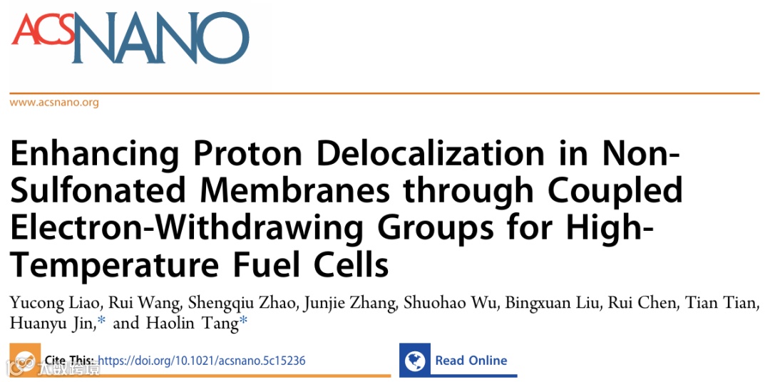 近日,武汉理工大学的唐浩林教授团队与中国科学院深圳先进技术研究院金桓宇教授合作,在国际知名期刊ACS Nano上发表题为“Enhancing Proton Delocalization in Non-Sulfonated Membranes through Coupled Electron-Withdrawing Groups for High-Temperature Fuel Cells”的文章。该文章提出了一种“耦合吸电子基团增强质子离域化”的策略,通过分子结构设计降低了全氟磺酰亚胺-苯基膦酸(PFSI-BPA)膜中的质子离域能垒,实现高效质子传导与热稳定性的协同提升,并且通过原位测量和理论计算相结合的方式得到了证实。结果表明,合成的 PFSI-BPA 的质子电导率比商业 Nafion® 211(NRE 211)高 1.4 倍。与含有供电子基团的全氟磺酰亚胺-乙基膦酸相比,PFSI-BPA 的质子电导率高出 3.2 倍。基于 PFSI-BPA 的燃料电池在 105°C 和 40% 相对湿度条件下实现了1.16 W cm-2的峰值功率密度,且具有出色的循环稳定性,运行 107 小时后性能仅下降 4.1%。这种策略有效地平衡了质子电导率和高温稳定性,使其在高温燃料电池应用中的聚合物结构方面具有广泛的适用性。