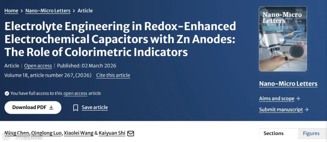 该研究将pH指示剂与氧化还原电解液设计有机结合,不仅阐明了pH指示剂在电解液中的作用规律,还为开发兼具状态感知与高性能的水系储能器件电解液提供了可行方案,有力推动了氧化还原增强型电化学电容器的实用化发展。