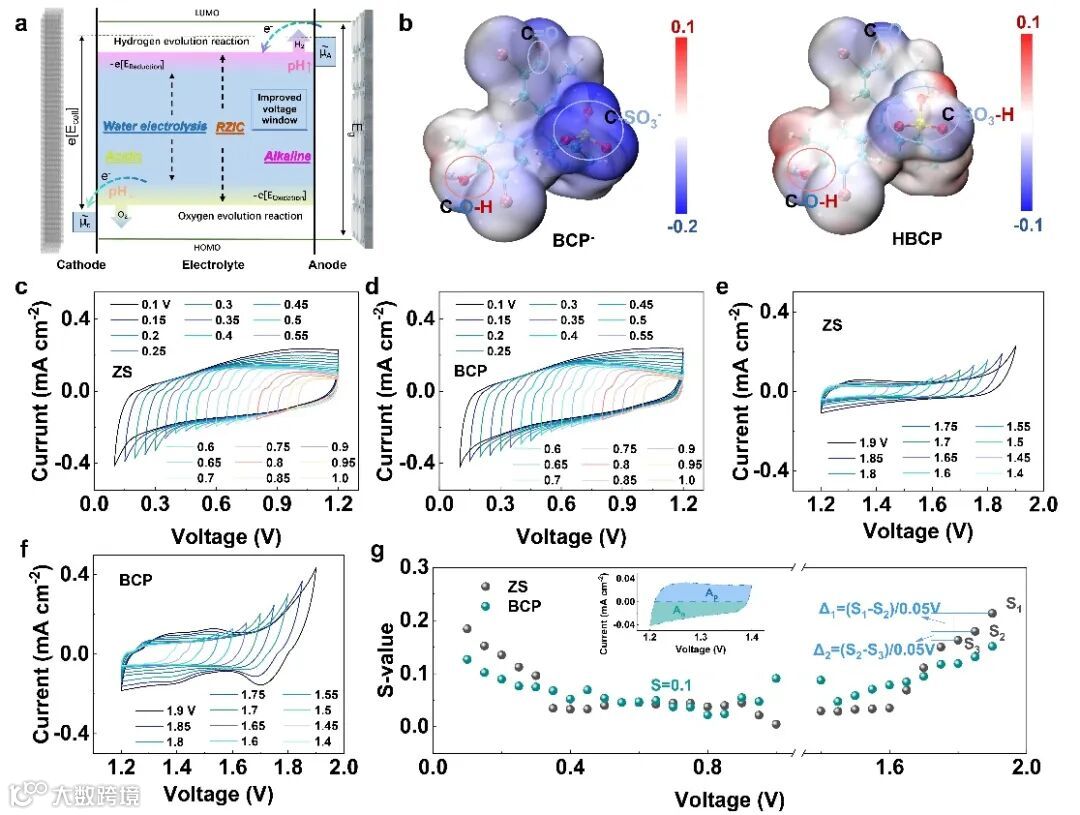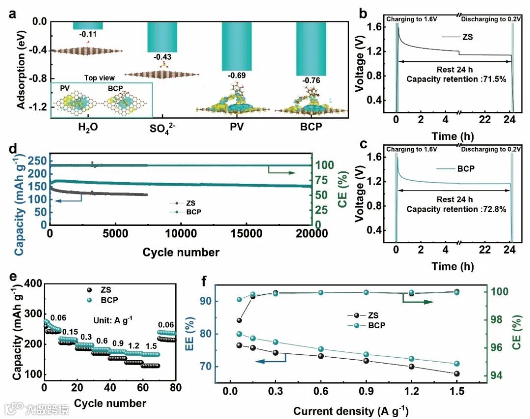 密度泛函理论计算表明,三苯甲烷染料因共轭芳环结构,在活性炭电极上的吸附能远低于水分子与硫酸根,可优先吸附并通过π-π相互作用抑制离子穿梭,有效降低器件自放电,BCP基RZICs静置24 h容量保持率达72.8%,优于基础电解液的71.5%。长循环测试显示,BCP基RZICs在0.2-1.6 V窗口内,1A g-1电流密度下的比容量达152.4 mAh g-1,20000次循环后容量保持率 87.7%,倍率性能与能量效率也显著提升。