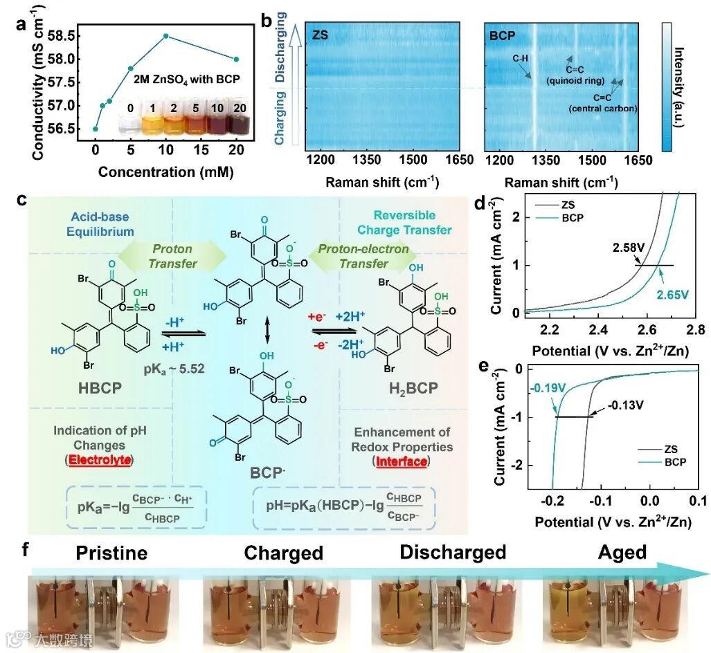 本部分探究了pH指示剂在电解液中的“质子-电子”协同转移(PET)行为,BCP 基电解液的电导率变化直观证实了染料与 Zn2+的络合效应。原位拉曼光谱表征显示,BCP 在电化学过程中出现 C-H、C=C 特征峰强度变化,发生质子化 - 去质子化转变,形成醌 - 酚盐杂化结构,电子离域性显著增强,电荷转移动力学提升。BCP 通过酸 - 碱平衡实现电解液 pH 缓冲,其解离反应为: