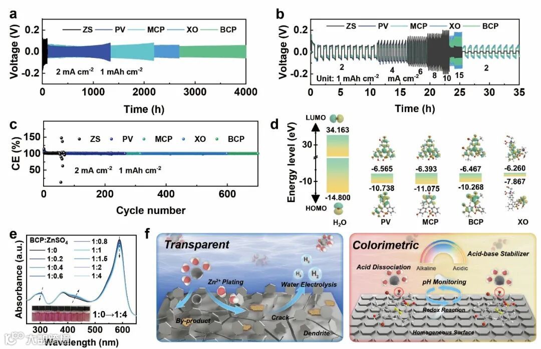 中山大学石铠源课题组与加拿大阿尔伯塔大学王晓磊老师合作,以三苯甲烷染料为pH指示剂,开发出一种适用于RZICs的多功能氧化还原电解液,成功实现了pH缓冲、电致变色响应与氧化还原活性的一体化集成。研究团队系统探究了邻苯二酚紫(PV)、溴甲酚紫钠(BCP)等四种三苯甲烷染料的性能,揭示了染料的“质子-电子”协同转移(PET)行为调控电解液性能的核心机制:质子转移实现电解液pH缓冲与器件状态可视化检测,电子转移促进酚-醌可逆氧化还原反应,提升电荷存储能力。其中BCP表现出最优性能,可有效抑制锌负极枝晶生长与析氢副反应,2 mA cm-2和1 mA h cm-2下将Zn//Zn对称电池循环寿命从94 h延长至4000 h;同时拓宽RZICs稳定电压窗口至0.2-1.6 V,显著提升其容量与循环稳定性。结合多种原位表征与理论计算,该研究阐明了pH指示剂在电解液中的作用规律,为氧化还原增强型水系储能器件的功能电解液设计提供了全新策略。