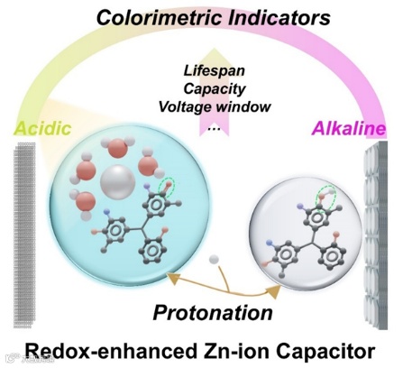 功能电解液构筑,多重性能集成:开发了以三苯甲烷染料作为pH指示剂的功能电解液,应用于氧化还原增强型锌离子混合电容器(RZICs);基于其质子耦合电子转移特性,实现了pH缓冲、电致变色响应与氧化还原活性的一体化集成。该pH指示剂在电解液中表现出“质子-电子”协同转移(PET)行为,有效提升了器件性能。 -