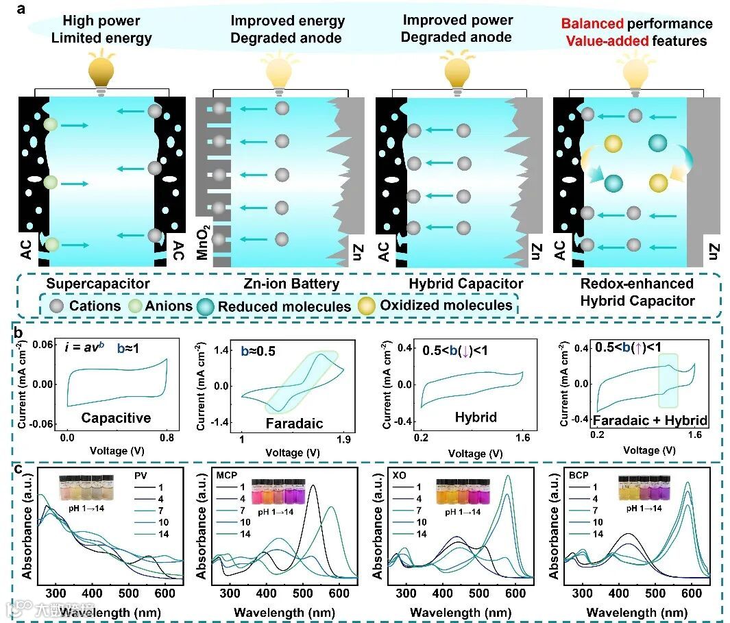 该研究以三苯甲烷染料为pH指示剂,成功开发了适用于氧化还原增强型锌离子混合电容器(RZICs)的多功能氧化还原电解液,创新性实现了pH缓冲、电致变色响应与氧化还原活性的协同集成,为水系储能器件的电解液工程提供了全新设计思路。