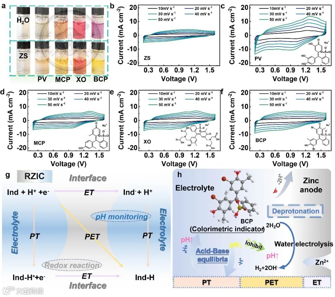 研究系统揭示了染料的“质子-电子”协同转移(PET)行为是调控电解液性能的核心机制:质子转移通过酸碱平衡实现电解液pH动态缓冲,有效抑制锌负极析氢、枝晶生长与副产物生成,同时借助电致变色效应实现器件工作状态的实时可视化诊断;电子转移通过酚-醌可逆氧化还原反应,提升电解液的电荷存储能力,增强 RZICs 的法拉第反应贡献。