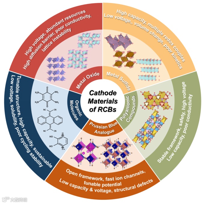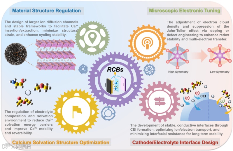 在总结归纳上述几种主要正极材料的应用现状及其存在的挑战后,为了跨越材料层面的限制并实现RCBs的高能量密度与长寿命,文章指出可以采取多维度的协同优化策略,包括材料结构调控、微观电子调控、溶剂化结构优化、正极/电解液界面设计等方法。