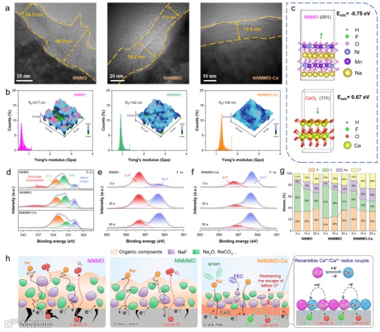 CeO2的低表面能抑制了电解液分解,促进形成"有机C-F外层+无机Na-F内层"的梯度CEI结构。该CEI层薄至12.9 nm,远低于NNMO的24.1-49.7 nm,且致密、机械强度高,杨氏模量达1.2 GPa,是NNMO的2倍,显著降低界面阻抗,Rcei仅212.8 Ω,而NNMO高达786.8 Ω。DFT计算表明CeO2的HF吸附能为0.67 eV,远低于NNMO的-0.75 eV,证实其优异的抗腐蚀性能。